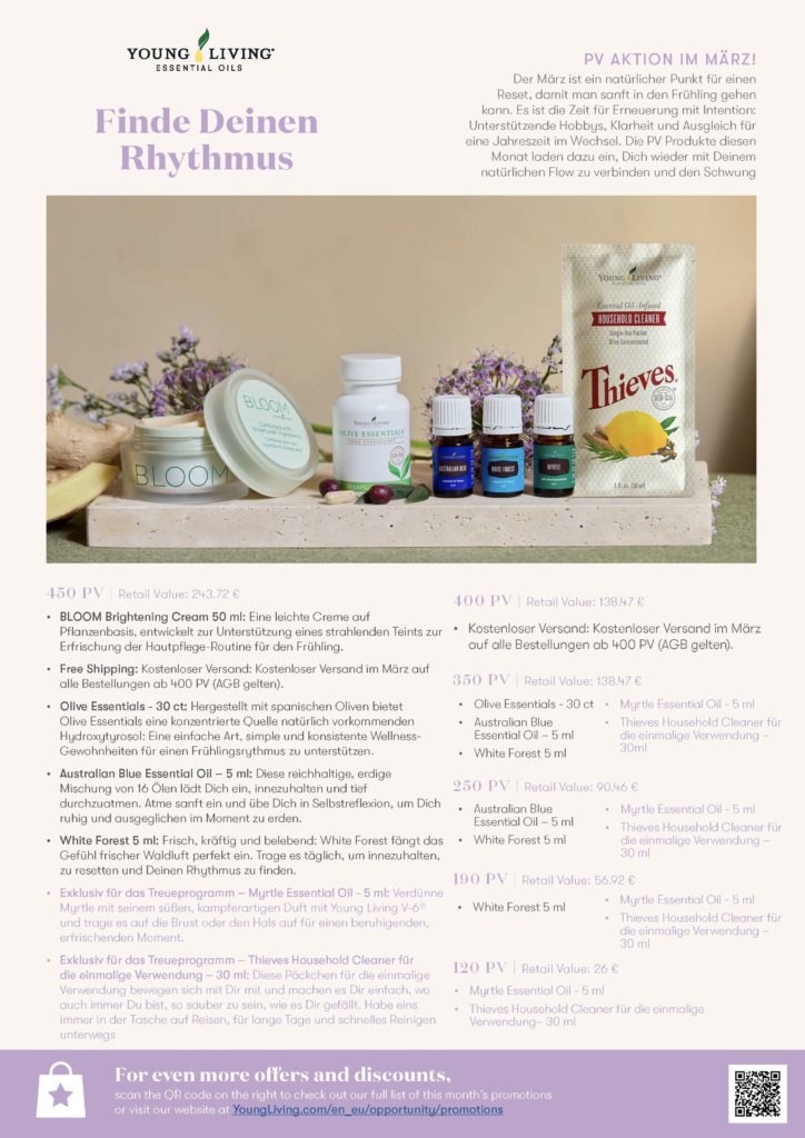 Der März ist ein natürlicher Reset-Punkt, um sanft in den Frühling überzugehen. Es ist die Zeit für Erneuerung mit Intention: Unterstützende Hobbys, Klarheit und Ausgleich für eine Jahreszeit im Wechsel. Die Produkte in der PV Aktion diesen Monat laden Dich ein, zu Deinem natürlichen Flow zu finden und den Schwung der neuen Jahreszeit willkommen zu heißen.